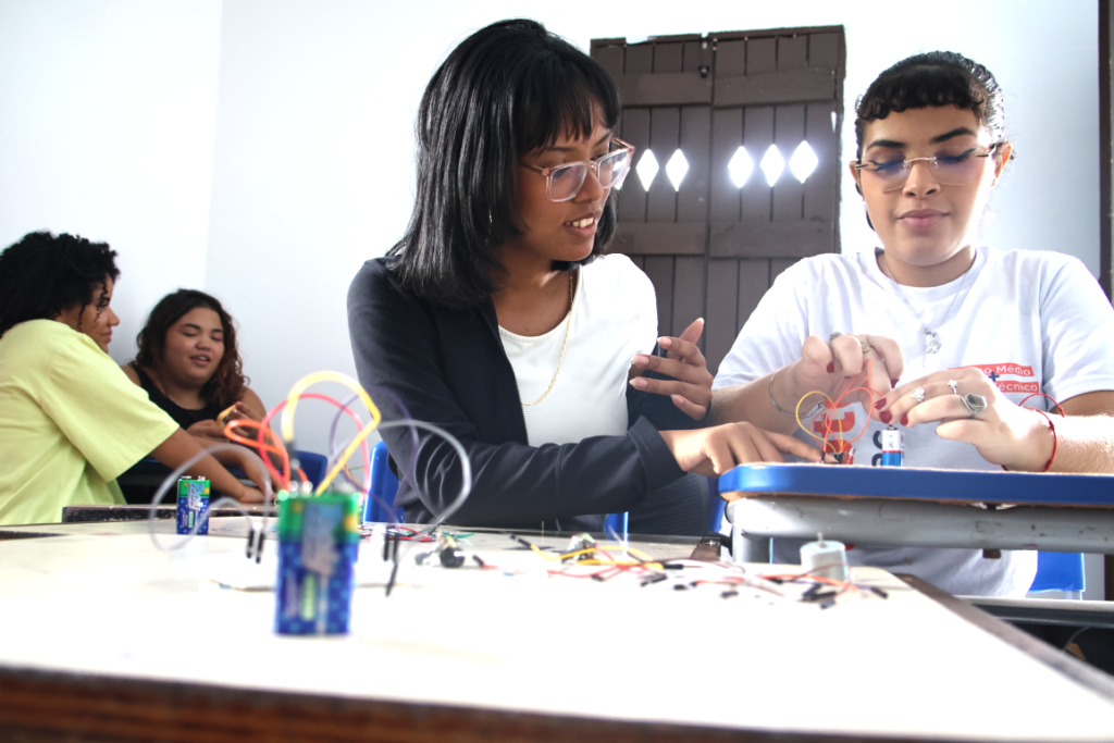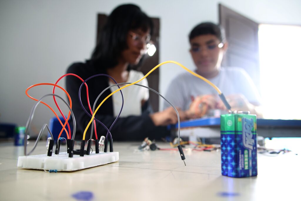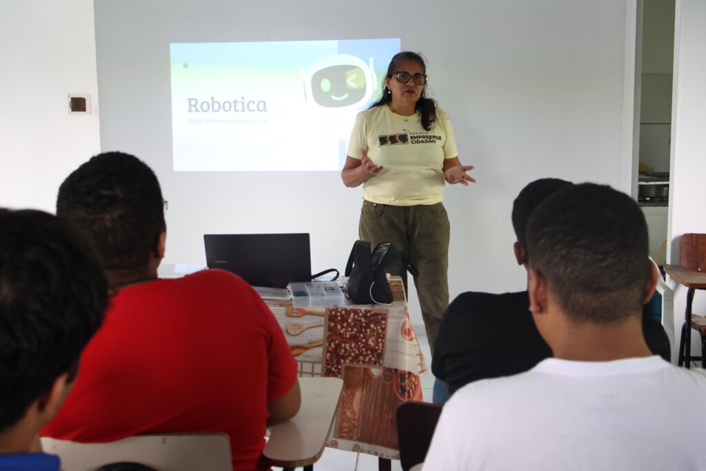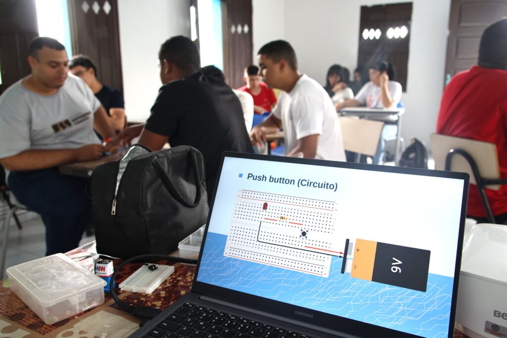 No curso de Robótica, os alunos têm contato inicial com conceitos fundamentais da área, por meio da robótica educacional. Segundo o professor Ygira Silva, as primeiras aulas utilizam recursos analógicos, como botões e LEDs, permitindo que os estudantes compreendam, na prática, o funcionamento de circuitos eletrônicos. Dessa maneira, o aprendizado acontece de forma gradual e acessível.